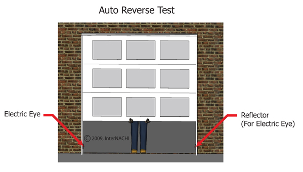 - automatic reverse system. As of 1991, garage doors are required to be equipped with a mechanism that automatically reverses the door if it comes in contact with an object. It is important that the door reverses direction and opens completely, rather than merely halting. If a garage door fails this test, inspectors should note it in their reports. A dial on the garage door opener controls the amount of pressure required to trigger the door to reverse. This dial can be adjusted by a qualified garage door technician if necessary.